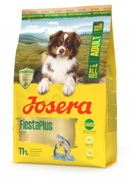 Oslávte vitalitu našich štvornohých priateľov: Josera FiestaPlus pre dospelých psov nielenže spestruje ich jedálniček vďaka svojim dvojfarebným granulám. Červené Vital Booster Chips v tomto krmive pre dospelých psov poskytujú vášmu psovi extra impulz k vitalite vďaka cenným vitamínom, taurínu a L-karnitínu. Lososová príchuť robí toto bezlepkové krmivo pre psov ešte chutnejším pre našich psích spoločníkov. Vylepšená receptúra obsahuje aj ešte viac lososových bielkovín ako predtým.