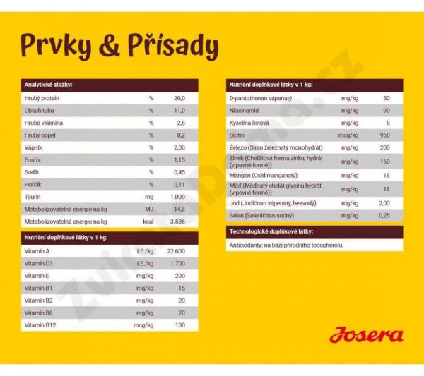 Doplnkové nutričné látky v kg: vitamín A 18.000mj, vitamín D3 1.800mj, vitamín E 200mg, vitamín B1 15mg, vitamín B2 20mg, vitamín B6 20mg, vitamín B12 100mcg, kyselina pantoténová 50mg, niacinamid 90mg, kyselina listová 5mg, taurín 1000mg, biotín 800mcg, železo (sulfát železa, monohydrát) 180mg, zinok (chelát zinku glycín, hydrát) 160mg, mangán 16mg, meď (chelát meďnatý glycín, hydrát) 15mg, jód (jodičnan vápnika) 2mg, selén 0,25mg