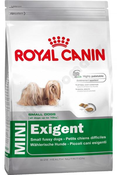 Royal Canin Mini Exigent vyhovuje vybíravému apetítu malých plemien psov vďaka špeciálnemu tvaru granúl, ktorý kombinuje dve rôzne textúry (chrumkavá zvonka / mäkká vnútri) a výber exkluzívnych príchutí.