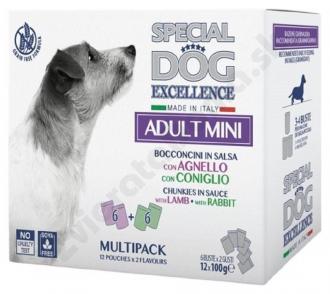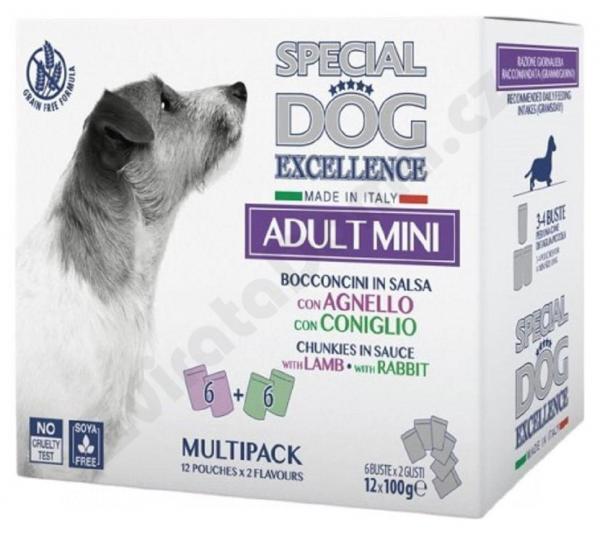 Výhodné multibalenie obsahujúce 12 kapsičiek po 100 gramoch s chutnými kúskami v omáčke pre dospelých psov malých plemien v dvoch rôznych príchutiach: