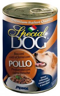 Zloženie: mäso a mäsové deriváty 45% (čerstvé kuracie mäso 14%), obilniny, vajcia a vaječné výrobky, minerálne látky