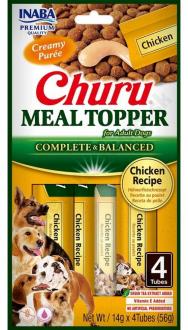 Psy už obyčajné suché krmivo nebaví. Spestrite im stravu krémovým Churu Meal Topperom s kuraťom a hovädzím, ktorý budú milovať. Churu Meal Topper je kompletné a vyvážené krmivo pre dospelé psy vyrobené zo surovín zodpovedajúcej ľudskej kvalite. Vyrobené z farmovo chovaných kurčiat a neobsahuje obilniny, konzervačné látky ani umelé farbivá. Má vysoký obsah vody, čo prispieva k celkovému zdraviu psov. Navyše je obohatený o taurín, extrakt zo zeleného čaju, vitamíny a minerály. S Churu Meal Topperom bude kŕmenie chutnejšie a zábavnejšie ako doteraz.