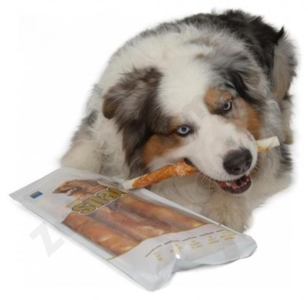 Mäkká, prírodná mäsová pochúťka pre psov - tyčinka z hovädzej kože obtočená plátkom lahodného kuracieho mäsa
