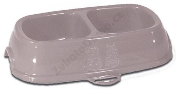 Plastová dvoumiska s gumovými prísavkami proti sklzu, ľahko umývateľná. Vhodná pre mačky a malé psy.